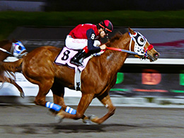 Running over a fast track while facing a light 2 mph headwind, the bay gelding surged forward after being bumped at the break, edging clear to earn the winner’s share of $18,300.