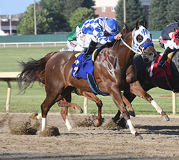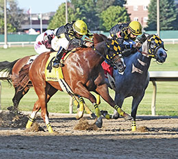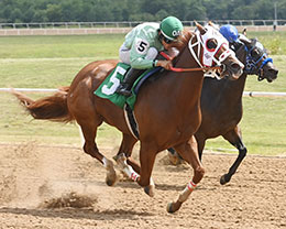 ALTOONA, IA—AUGUST 16, 2025—Margarets Cowboy fought gamely in the final strides to capture the $70,125 John Deere Prairie Meadows Juvenile Challenge Stakes on Saturday evening at Prairie Meadows.