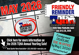 ELGIN, TX-APRIL 21, 2026–The Texas Quarter Horse Association issued a reminder that consignment forms for the 2026 TQHA Yearling Sale are available online along with an AQHA Transfer Report. This sale is for Accredited Texas Bred Yearlings (foals of 2025).