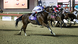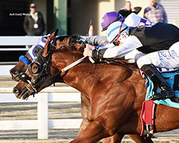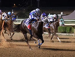 Running over a fast track while facing a light 2 mph headwind, the bay gelding surged forward after being bumped at the break, edging clear to earn the winner’s share of $18,300.