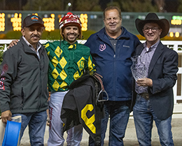 The winning connections of Kevins Wise Corona accept the First Down Dash Handicap trophy at Los Alamitos on Saturday. © Los Alamitos “He’s been a great horse his whole career, from a 2-year-old on he’s just been a super horse,” Jones added. “He’s a barn favorite. It’s nice to a stakes win for the Parsons. They love their horses and they’re real excited too. That’s what it’s all about.”