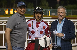 "I was in Phoenix for the Oklahoma City Thunder game but flew in just in time to watch this race," said Newcomb, an Oklahoma native. "I'm happy I did. This is unbelievable. Of course, I've never started a nine-year-old, so you don't what you're going to get. I said in the paddock that his coat, his eyes, he looked as young as a seven-year-old. I couldn't be any happier and thrilled. (Martin Arriaga) did a great job. Juan said that he's never had a horse in his barn for these many years. It's wild. We paid him late for the Vessels Maturity. That will be next. I'm trying not to think ahead. He's so special, I'm trying just to enjoy the moment."