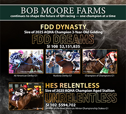 NORMAN, OK—JANUARY 4, 2026—Bob Moore Farms once again stamped its influence on the national Quarter Horse racing scene in 2025, as two of its cornerstone stallions — FDD Dynasty and Hes Relentless — sired champions at the sport’s highest level.