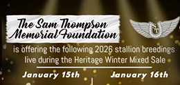 OKLAHOMA CITY, OK—JANUARY 12, 2026–The Sam Thompson Memorial Foundation will be offering multiple breeding opportunities to some of the industry’s top stallions during the 2026 Heritage Place Winter Mixed Sale.