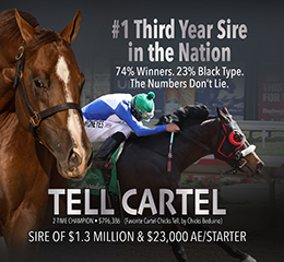 Tell Cartel currently ranks as the nation’s #1 leading third-year sire and has consistently finished among the top 10 nationally with each of his first two crops to race.