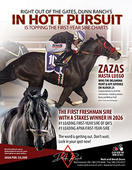 OKLAHOMA CITY, OK–MARCH 21, 2026–Dunn Ranch has unveiled another early-season standout, as Hott Pursuit has quickly asserted himself atop the 2026 Quarter Horse and APHA first-year sire standings.
