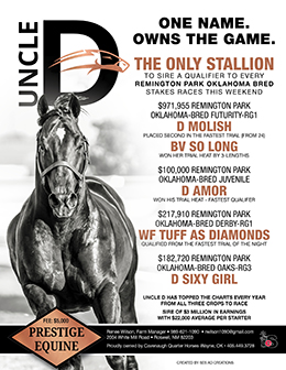 ROSWELL, NM–APRIL 6, 2026–Uncle D is the only stallion represented across all four Oklahoma-Bred stakes at Remington Park this weekend, with at least one qualifier advancing to each final.