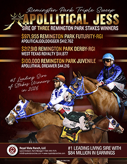 Apollitikal Dreamer SI 91 won the $100,000 Remington Park Juvenile Stakes and now has earnings of $44,216, putting together a strong performance from gate to wire.