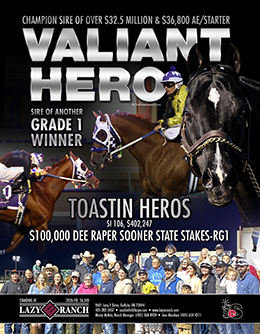 OKLAHOMA CITY, OK–APRIL 21, 2026–Valiant Hero sired another Grade 1-caliber performance Saturday night at Remington Park by Toastin Heros, who delivered a statement win in the $100,000 Dee Raper Sooner State Stakes, taking down AQHA World Champion Empressum in a hard-fought 400-yard showdown for Oklahoma-breds.