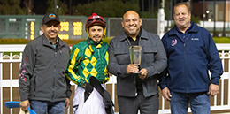 The winning connections Phoebes Baby Girl accept the $20,000 Dashingly Handicap trophy at Los Alamitos on Sunday. © William Zuazo“She ran a really nice race,” Jones said. “She’s starting to get sharp again. She showed a lot of talent as a 3-year-old, then we had a little trouble in the beginning of her 4-year-old year. She just wasn’t getting out of the gate. We put her in a flipping halter and she’s learned how to break with it. Since then, she’s doing great. Ayala fits her well and does a great job with her. We’re proud of her. She’s got the talent and she did it tonight. We’re happy.”