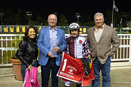 The winning connections of Beuteeful accept the $415,500 Los Alamitos Oaks trophy at Los Alamitos on Saturday.© William Zuazo