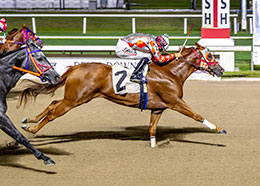 Famous Flying Cowgirl, under jockey Randy Edison, Jr., won an Allowance for 3-year-olds and up at Evangeline Downs on October 16. © Hodges Photography Carrizales is grateful for the support of his owners, including Juan J. Bazaldua and Jesus E. Del Bosque of J and J Stables, LLC, Alberto Salinas, and Edgar Rosales.