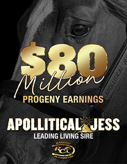 PAOLI, OK–OCTOBER 7, 2025–The industry’s leading living sire, Apollitical Jess, has officially surpassed the $80 million mark in progeny earnings. The 2010 AQHA Racing World Champion, owned by Rancho El Cabresto, Inc., continues to dominate both on the racetrack and in the sales ring.