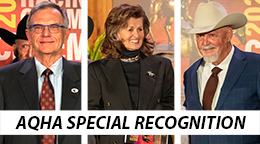 OKLAHOMA CITY, OK–JANUARY 15, 2026–Each year, the American Quarter Horse Association recognizes people within the racing industry who serve to make it a better place. The 2025 award winners include Bruce Salard honored with the John Andreini Special Recognition Award; Christine Hudson earning the Mildred N. Vessels Special Achievement Award; and Lloyd Yother earning the Gordon Crone Special Achievement Award.
