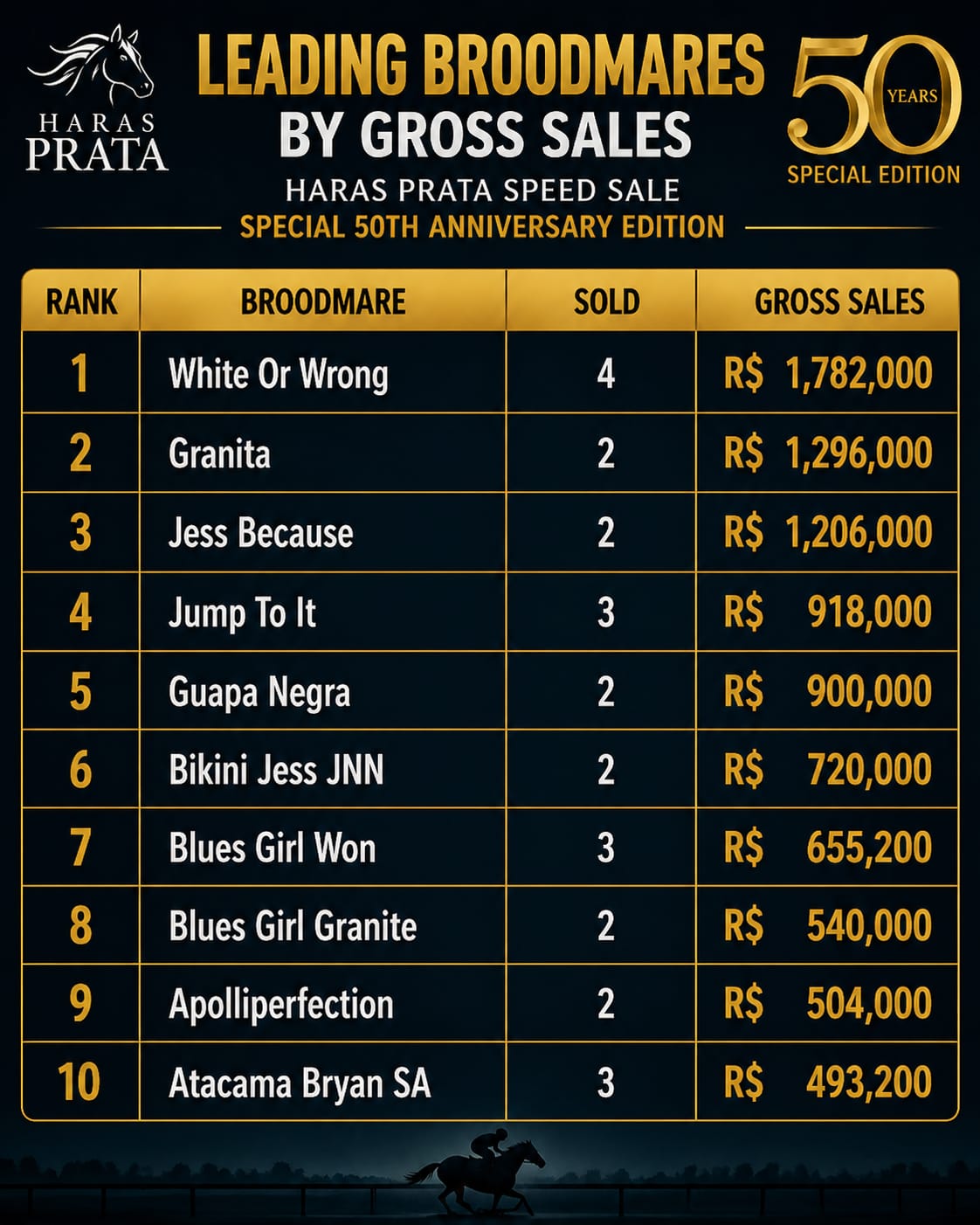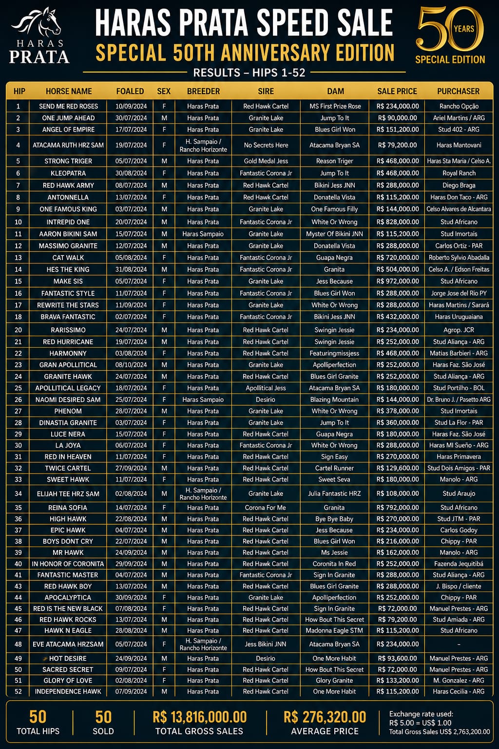 “I have lived 50 years for the Quarter Horse. This 50th anniversary of Haras Prata is a very important milestone for us. During all this time, the horse has brought me great friendships, which greatly helped our breeding program and brought us many joys and victories. It has been very important for the unity and togetherness of our family,” said Érico Braga, who concluded by thanking everyone who purchased at his special 50th anniversary sale.