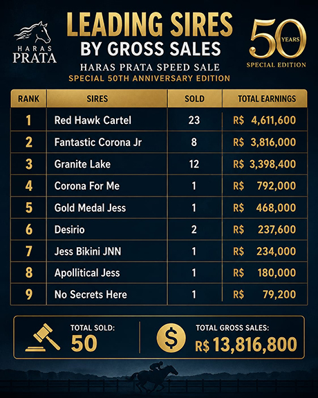In total, the 23 offspring by the California-born stallion grossed R$ 4,611,600 (US$ 920,000). Below are the sales totals for each sire: CLICK HERE TO ENLARGE IMAGE.
