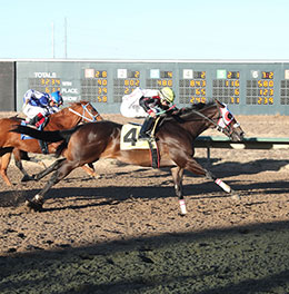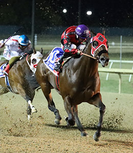 Running over a fast track while facing a light 2 mph headwind, the bay gelding surged forward after being bumped at the break, edging clear to earn the winner’s share of $18,300.