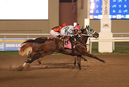OKLAHOMA CITY, OK–APRIL 18, 2026–Surprise Temptation surged to a dramatic nose victory Saturday night in the Grade 2 $58,000 Bob Moore Memorial Stakes at Remington Park, capturing the 300-yard dash for 3-year-olds and up in 15.077 seconds over a fast track.