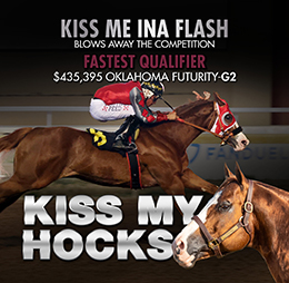 GUTHRIE, OK–MARCH 7, 2026–Kiss My Hocks wasted no time making noise in the new season. The two-time AQHA Racing Champion stallion kicked off the 2026 campaign in emphatic fashion Friday night at Remington Park when Kiss Me Ina Flash delivered an impressive performance in the first night of trials for the Oklahoma Futurity.