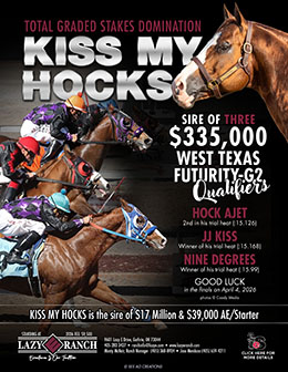 The momentum continued this weekend when the stallion dominated the West Texas Futurity (G2) trials, siring three qualifiers. Hock Ajet, JJ Kiss, and Nine Degrees will all return for the April 4 final.
