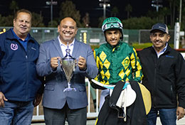 Marketing Director Orlando Gutierrez presents the Las Damas stakes trophy to Paul Jones, Henry Reynoso Lopez, and Roque Conzalez. © William Zuazo "I just love this mare," Jones said. "When she gets a clean break and a good trip, she just doesn't lose and gets the job done. She doesn't always get out of the gate. She'll have a little bad luck and doesn't get away, has a couple of mishaps. We gave her a little layoff, pulled some embryos out of her, and it took us a while to get her back after the Charger Bar. This is her third race back and she's really coming back into form. Tonight, she got the perfect trip, clean break, good run and she ran her race. She's full of talent."