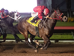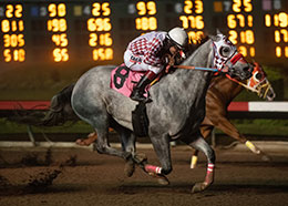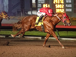 Whos The V, under jockey Francico Calderon, easily wins the ninth trial on Sunday night. © William Zuazo Draw a line across that troubled start and Beuteeful's first four outings saw her winning by margins of 1 ½ lengths, ¾ lengths, 1 ½ lengths when winning the Kindergarten and then by a jaw dropping three lengths in her Golden State Million trial win. For the Two Million trials, Beuteeful was back to her dominant ways, leading from gate to wire in route to a comfy ½ length win.
