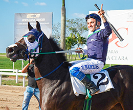 The jockey Vicente Barros and the filly Coronita In Red. © Eduardo Custódio Bred by Érico Braga, of Haras Prata, one of the greatest Brazilian breeders of all time, Coronita In Red qualified with only the fourth-fastest time among the winners, with a mark of 16.606 seconds, at a distance of 330 yards.