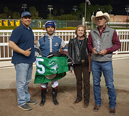 One Sweet Duck’s winning connections in the Virginia Hyland Stakes at Los Alamitos.© William Zuazo Under a poised ride from jockey Armando Viramontes, she turned back a late surge from runner-up CCR Political Wrap to secure the victory by a neck in a sharp time of :17.534.