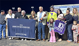 The winning connections of Amarillis accept the Remington Park Oklahoma-Bred Oaks stakes trophy Saturday night.© Leann Noguera / StallioneSearch