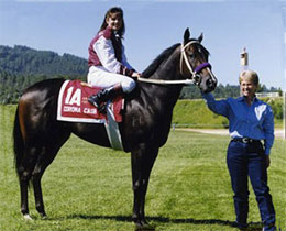 Corona Chick with trainer Donna McArthur and jockey Tami Purcell the day after winning the 1997 All American Futurity at Ruidoso Downs.