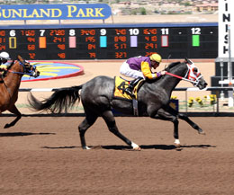 SUNLAND PARK, NM—APRIL 11, 2010—Freda Draper's home-bred Cd Frontier Justice kicked off his 3-year-old campaign on Saturday with a track record setting performance at Sunland Park.