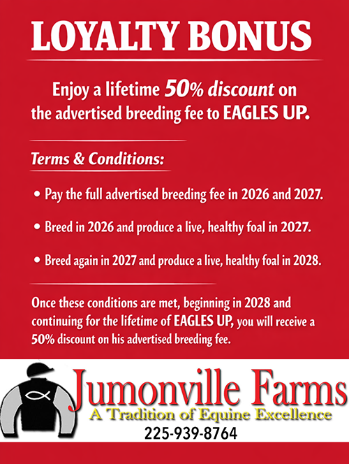 One Famous Eagle x U R Blue, by Walk Thru Fire 2026 FEE: $2,500 2026 Introductory Fee. CLICK HERE FOR INFORMATION ON RECEIVING A LIFETIME LOYALTY BONUS TO EAGLES UP! Property of: Jumonville Farms |